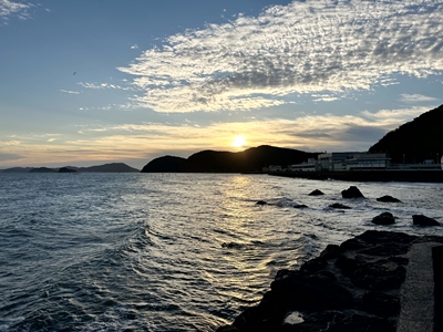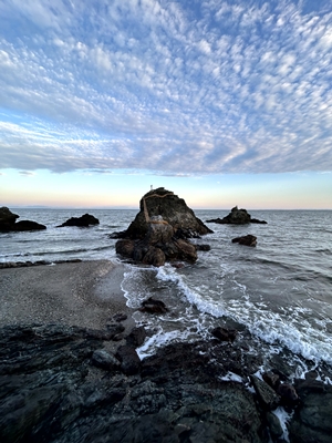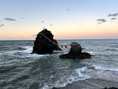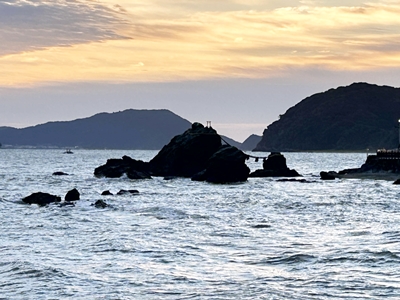 朝焼けがとても美しく、空と海と夫婦岩の対比が印象的でした。