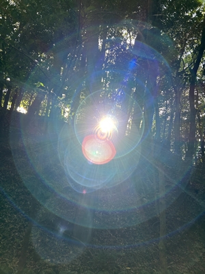 参道は高い木々で覆われているため、薄暗いのですが、時折まばゆい光が差し込んで、