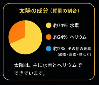 太陽は、水素(約74%)、ヘリウム(約24%)、他の元素(酸素・炭素・鉄など約2%)から組成される